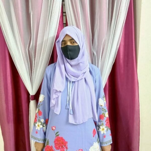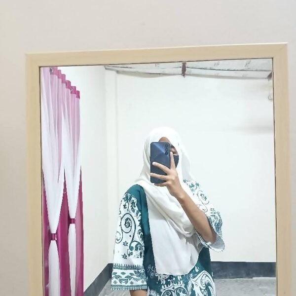 Women’s Premium White & Dark Green Two Piece Color and Pattern: The main color scheme is white with a prominent dark teal or deep green pattern. The pattern features large, intricate floral and swirling motifs, along with smaller, scattered star-like elements, particularly on the lower part of the tunic and pants. Style: It consists of a long tunic (kameez) with three-quarter sleeves, matching patterned pants (salwar), and a plain white headscarf (dupatta or hijab). The tunic has a relaxed fit and the pants appear to be a comfortable, straight-leg or slightly tapered style.
