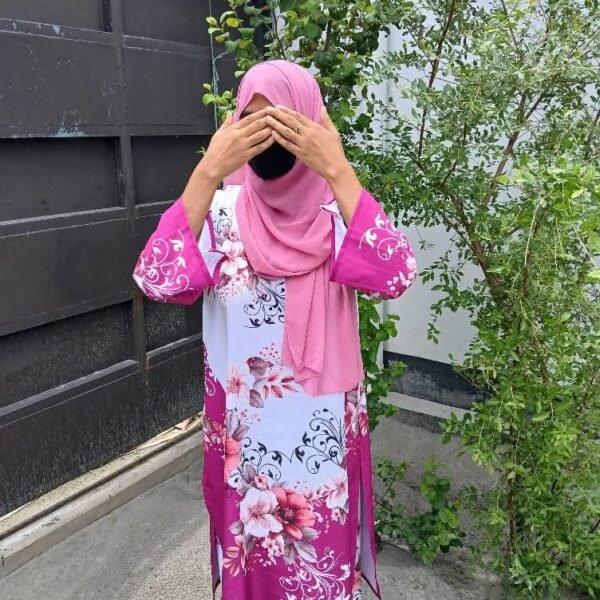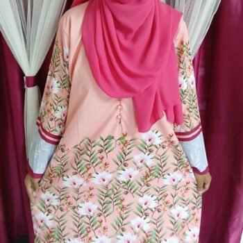 Women’s Premium Peach Print Two Piece Dress/Abaya: The bottom piece is a long dress or abaya featuring a light pink base color with an all-over floral pattern in shades of green and possibly lighter pink or white. The sleeves are a notable design element, appearing to have a contrasting light blue or grey cuff with white detailing, possibly a layered or wide-cuffed style.