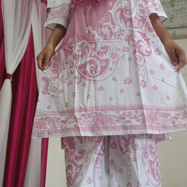 Women’s Premium Pink White Print Two Piece Color Scheme: Predominantly white with intricate pink patterns. Top (Kameez/Tunic): Features a loose-fitting, knee-length or mid-thigh length tunic with three-quarter sleeves. The design includes floral and swirling motifs in pink, with a distinct border pattern along the hem. Bottom (Salwar/Pants): Appears to be wide-legged pants (salwar or palazzo style) matching the top’s design, also in white with pink floral and star-like patterns.